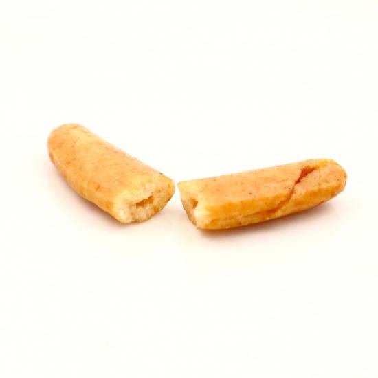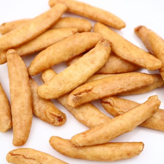 1 9 2 4年の誕生当時に近いカタチを追求し、もち米1 0 0%の生地と昔ながらの製法で、少し大ぶりな柿の種を再現。