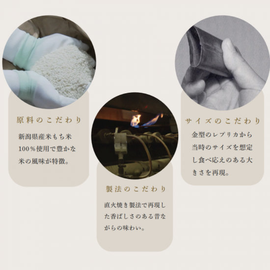 もち米には「新潟県産」を1 0 0%を使用し、米本来の豊かな風味と心地よい歯ごたえを大切にしています。