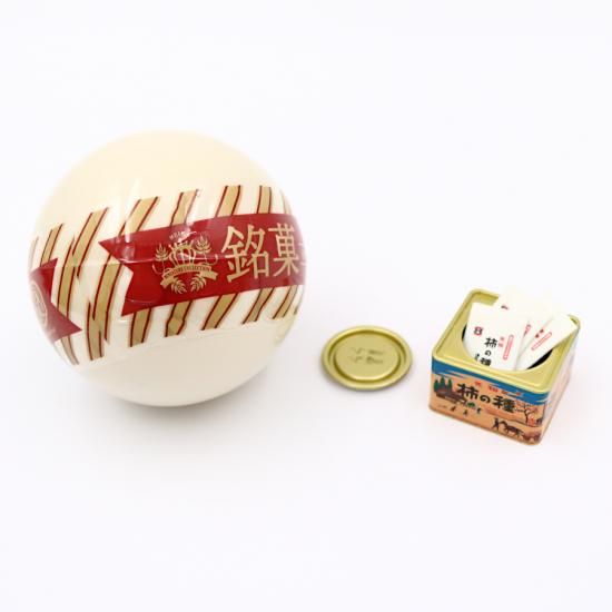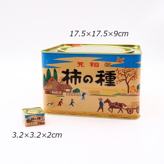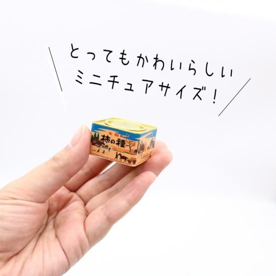 浪花屋の代表商品でもある元祖柿の種12袋缶入りのミニチュア入り。